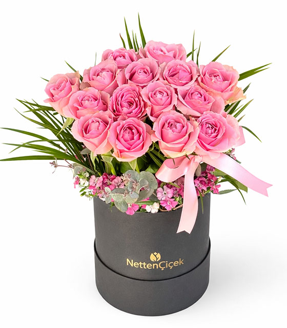 Yuvarlak silindir kutuda 15 adet pembe gül ve hüsünüyusuf çiçekleri ile hazırlanan kutuda gül aranjmanı