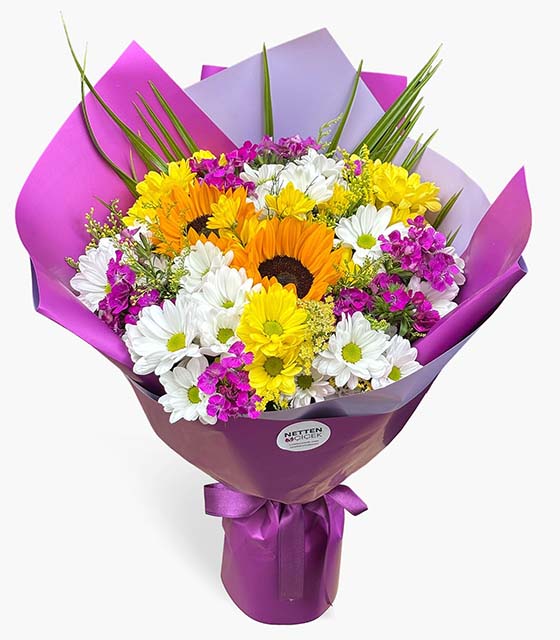 Güne Buketi, enerjisiyle iç ısıtan ayçiçekleri, masum papatyalar ve zarif hüsnüyusuf çiçeklerinin mükemmel uyumuyla hazırlandı. Doğanın canlı renklerini bir araya getiren bu özel aranjman; doğum günü, geçmiş olsun, kutlama veya “iyi ki varsın” demek için ideal bir seçimdir. Sevdiklerinize mutluluk, pozitif enerji ve güneş gibi bir gülümseme hediye edin.