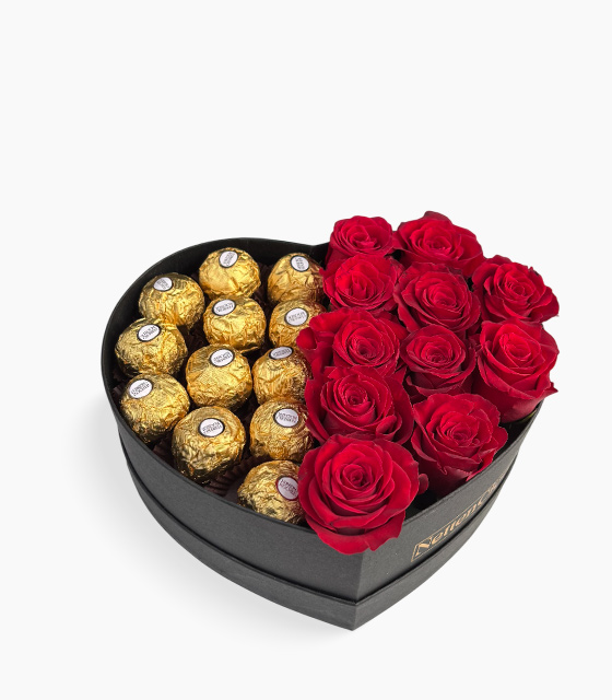 Kalp Kutuda Kırmızı Gül ve Çikolata Aranjmanı, romantik tasarımıyla duygularınıza anlam katıyor. Şık siyah kalp kutu içerisinde yer alan canlı kırmızı güller, tutkunun ve sevginin sembolü olurken; altın ambalajlı enfes çikolatalar hediyenize tatlı bir dokunuş katıyor.