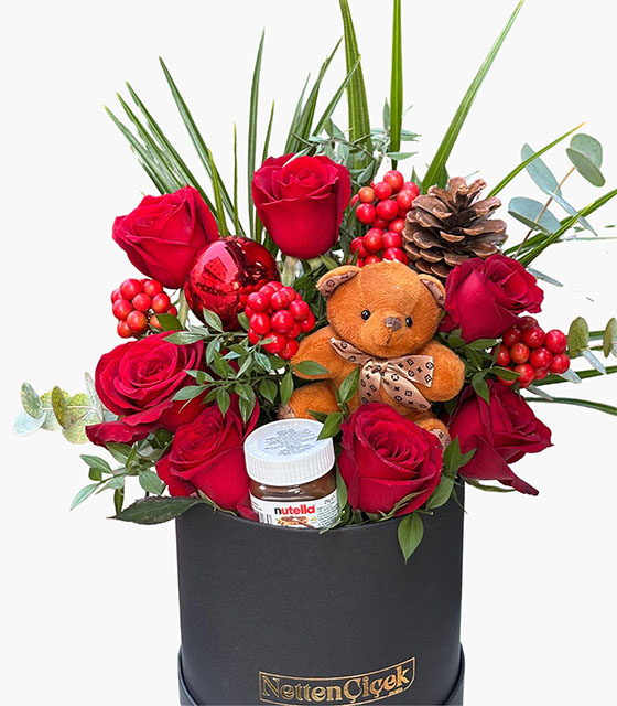 Siyah yuvarlak kutuda kırmızı gül, kokina çiçieği, ayıcık ve nutella ile hazırlanan yeni yıl çiçek tasarımı