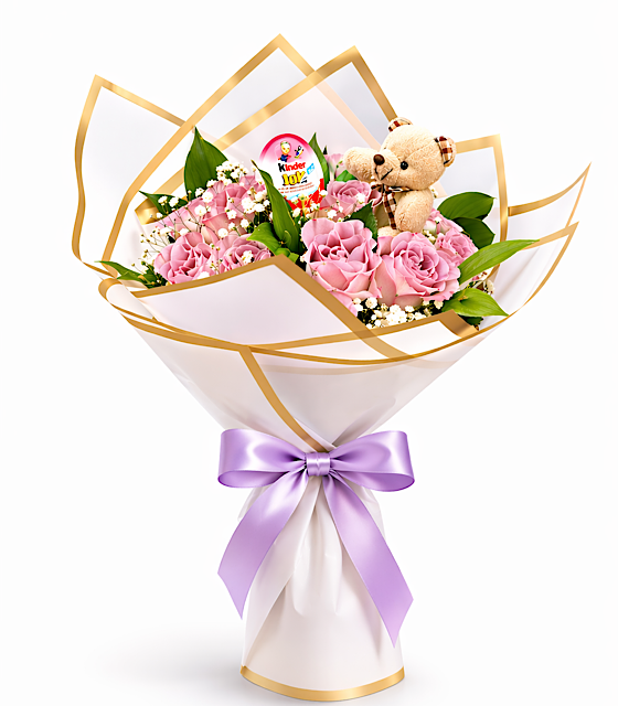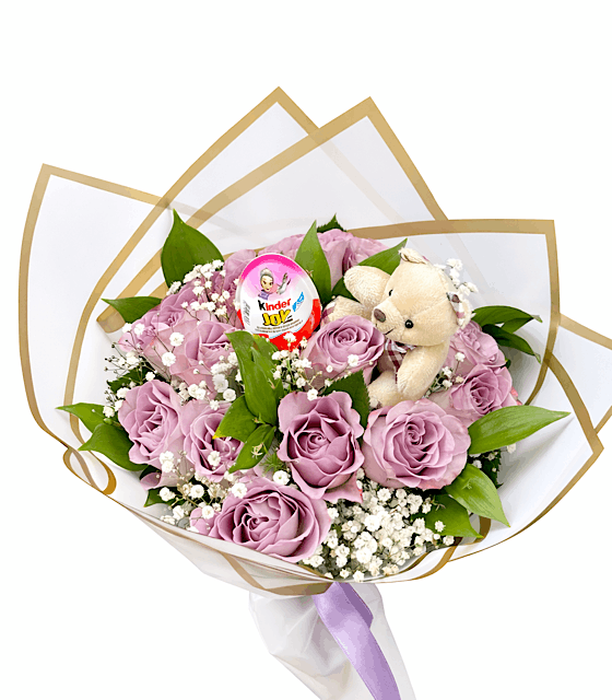 15 adet taze lila gülün zarafeti, ferah okaliptus dokunuşu, lezzetli Kinder çikolata ve sevimli peluş ayıcıkla birleşerek unutulmaz bir sürprize dönüşüyor. Premium tasarımı ve göz alıcı sunumuyla doğum günü, yıldönümü ve özel anlarda duygularınızı en etkileyici şekilde ifade etmenizi sağlar. Şimdi sipariş verin, aynı gün teslimat avantajıyla mutluluğu anında ulaştırın!