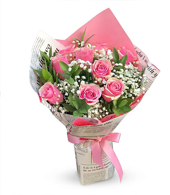 Cipsofilya ve yeşillikler ile hazırlanan cipsolu 9 adet pembe gül buketi