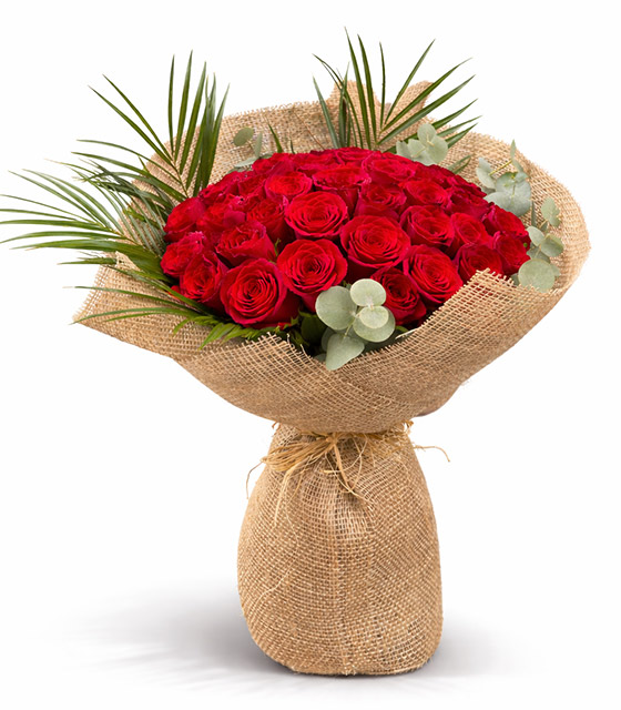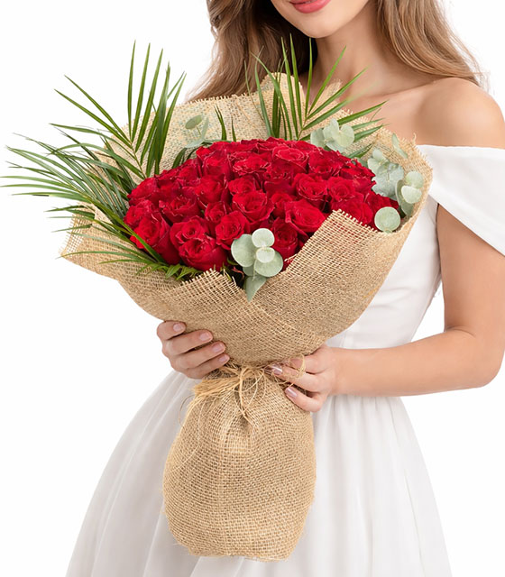 Dekoratif okaliptus yaprakları ve feniks yaprakları ile hazırlanan 50 adet gösterişli kırmızı gül buketi