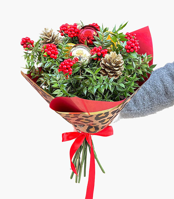 Geleneksel olarak yılbaşında şans getirdiğine inanılan kokina, bu özel buketin merkezinde yer alarak hem dekoratif hem de anlamlı bir hediye alternatifi sunar. Leopar desenli özel ambalajı ve kırmızı kurdelesiyle şık bir sunuma sahip olan bu aranjman; ev, ofis ve tüm yılbaşı organizasyonları için mükemmel bir dekorasyon tamamlayıcısıdır.