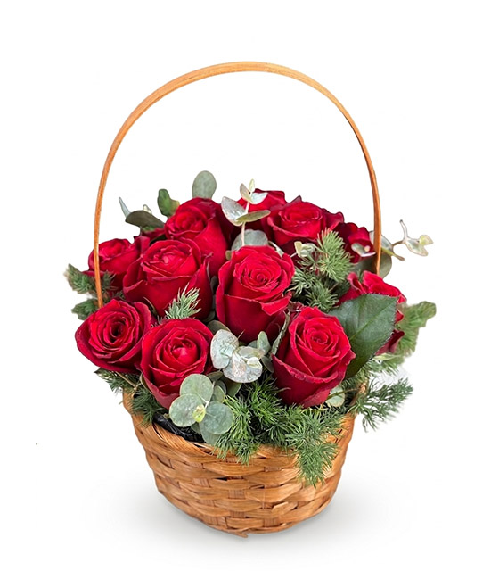 Okaliptüs ve mevsim yeşillikleriyle süslenmiş Hasır sepette 13 adet kırmızı gül aranjmanı