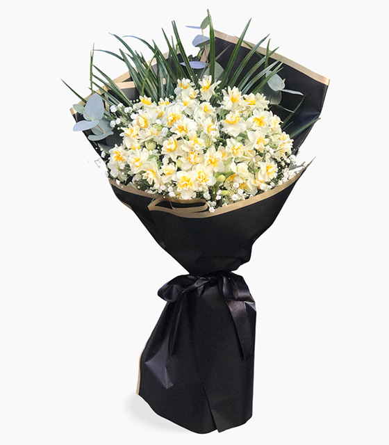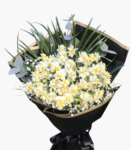 Dekoratif yeşillikler ile hazırlanan siyah fonlu 25 adet mis kokulu nergis çiçeği buketi
