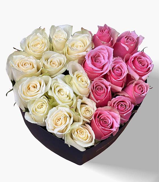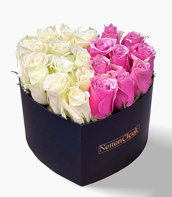 Zarif siyah kalp kutuda pembe ve beyaz güllerle hazırlanmış romantik aranjman. Aynı gün teslimatla sevdiklerine aşk dolu bir hediye gönder!