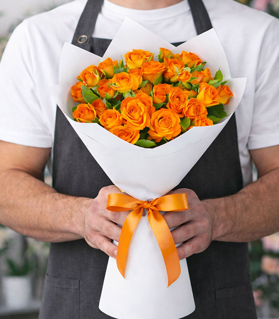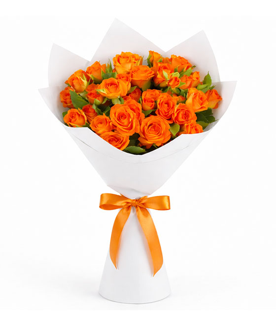 Beyaz buket kağıdı ile dış kaplaması yapılan turuncu çardak gül buketi,
