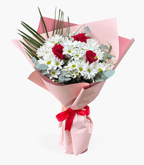 Pembe ambalajda sunulan kırmızı güller ve beyaz papatyalar, sevginizi en zarif ve romantik şekilde anlatmak için hazırlanan çiçek buketi