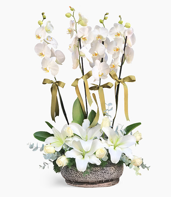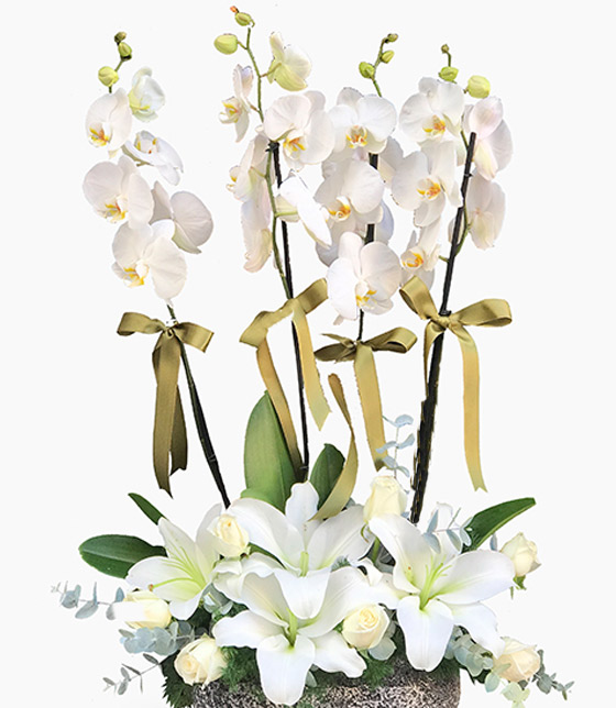 Dört dal beyaz orkide, beyaz lilyum ve beyaz güller ile hazırlanan zarif orkide aranjmanı