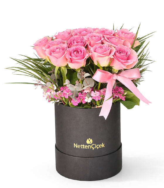 Yuvarlak silindir kutuda 15 adet pembe gül ve hüsünüyusuf çiçekleri ile hazırlanan kutuda gül aranjmanı