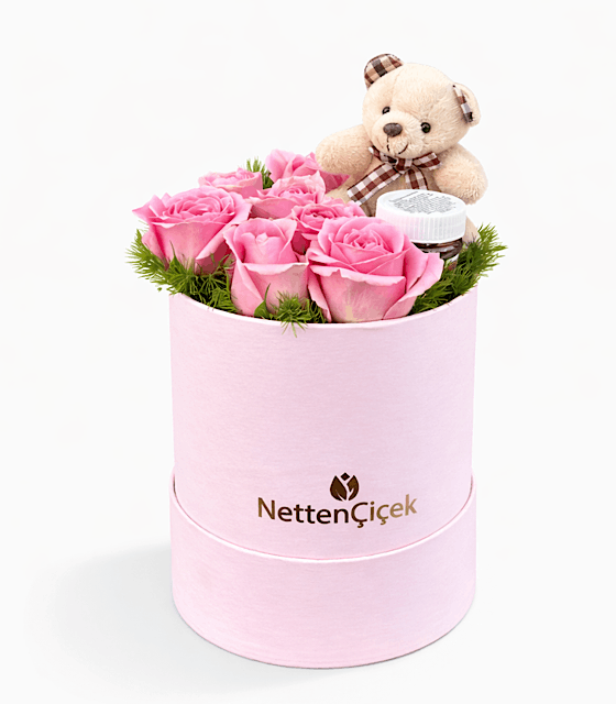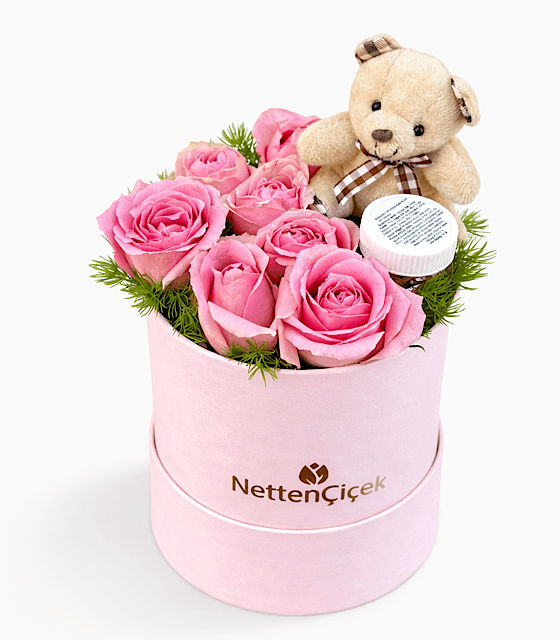 7 adet Pembe Gül, 1 adet Mini Ayıcık, 1 adet Nutell ile hazırlanmaktadır
