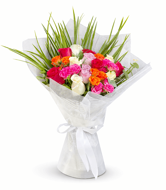 Renkli çardak gülleri ile hazırlanan şık renkli gül buketi