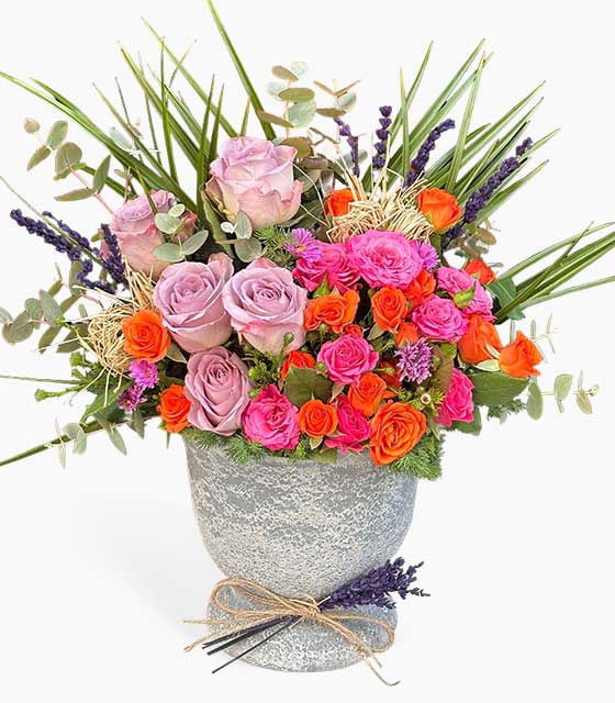 Üç ayaklı saksıda renkli güller ile hazırlanan dekoratif çiçek aranjmanı.Stok durumuna göre saksı renginde farklılık olabilmektedir.