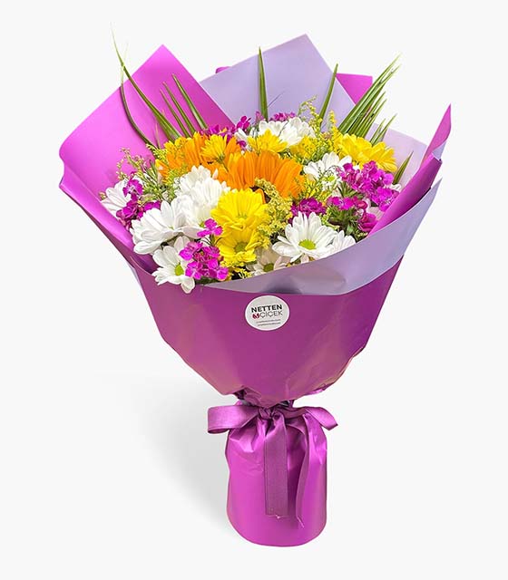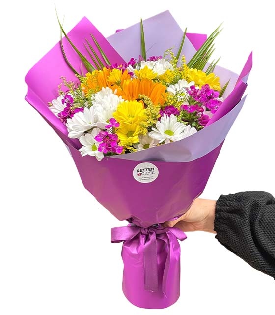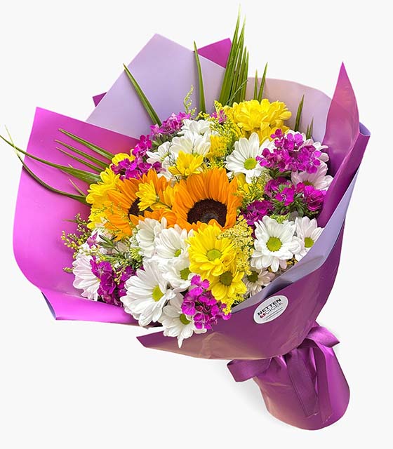 Güne Buketi, enerjisiyle iç ısıtan ayçiçekleri, masum papatyalar ve zarif hüsnüyusuf çiçeklerinin mükemmel uyumuyla hazırlandı. Doğanın canlı renklerini bir araya getiren bu özel aranjman; doğum günü, geçmiş olsun, kutlama veya “iyi ki varsın” demek için ideal bir seçimdir. Sevdiklerinize mutluluk, pozitif enerji ve güneş gibi bir gülümseme hediye edin.