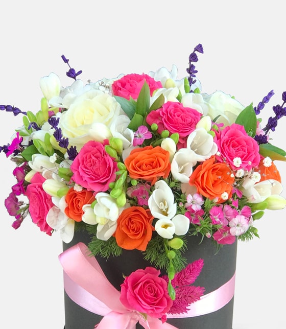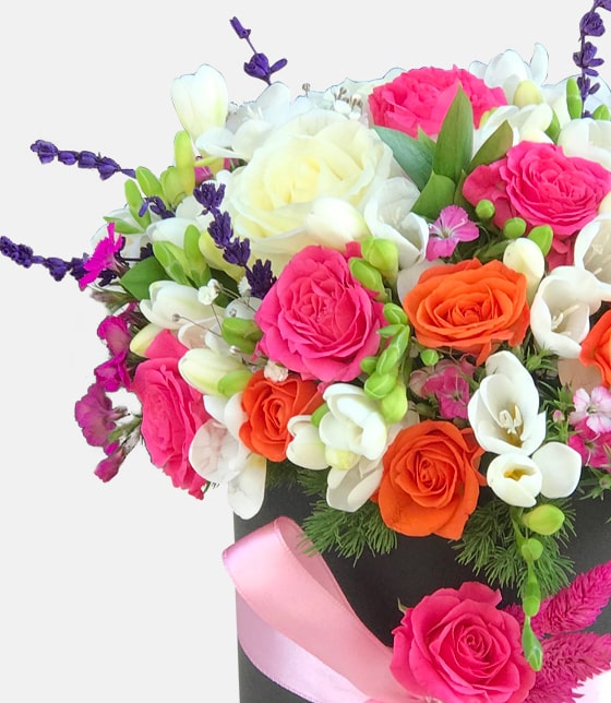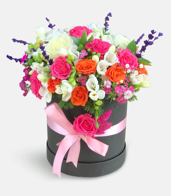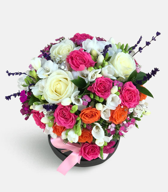 Silindir kutuda kokulu beyaz frezya çiçeği, beyaz gül, turuncu mini gül, pembe mini gül, beyaz gül ve lavantalar ile kokulu çiçek aranjmanı