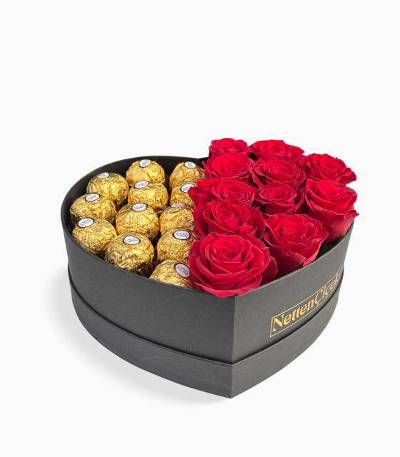 Kalp Kutuda Kırmızı Gül ve Çikolata Aranjmanı, romantik tasarımıyla duygularınıza anlam katıyor. Şık siyah kalp kutu içerisinde yer alan canlı kırmızı güller, tutkunun ve sevginin sembolü olurken; altın ambalajlı enfes çikolatalar hediyenize tatlı bir dokunuş katıyor.