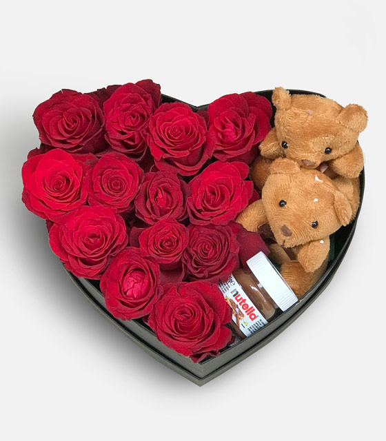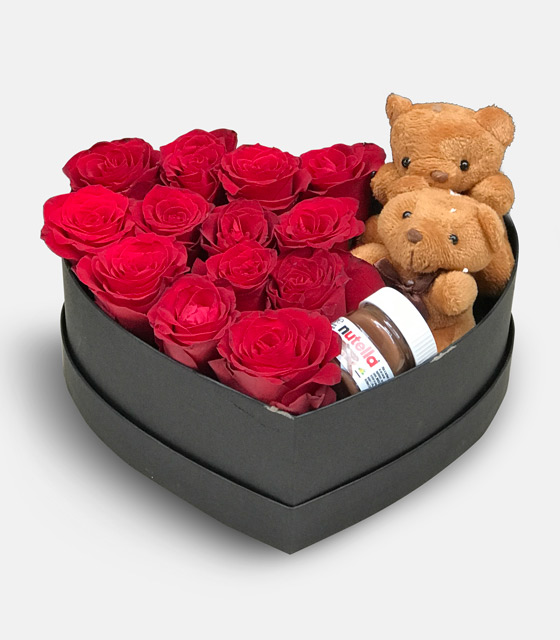 Kalp şeklindeki siyah kutuda iki adet 10 cm ayıcık, 25 gram nutella ve kırmızı güller ile sevdiklerinizi mutlu etmenin en güzel yolu!
