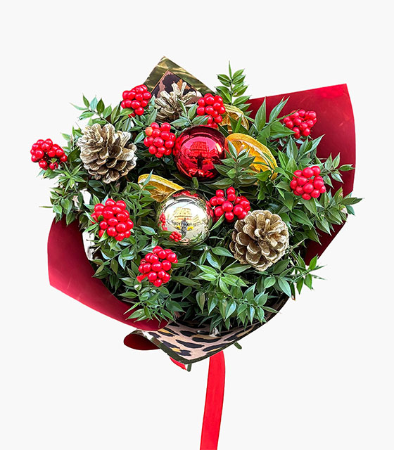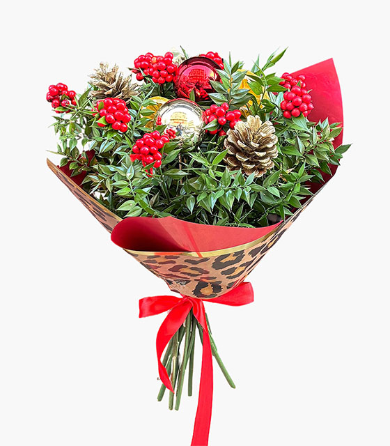 Geleneksel olarak yılbaşında şans getirdiğine inanılan kokina, bu özel buketin merkezinde yer alarak hem dekoratif hem de anlamlı bir hediye alternatifi sunar. Leopar desenli özel ambalajı ve kırmızı kurdelesiyle şık bir sunuma sahip olan bu aranjman; ev, ofis ve tüm yılbaşı organizasyonları için mükemmel bir dekorasyon tamamlayıcısıdır.
