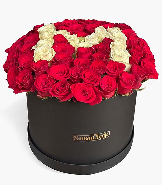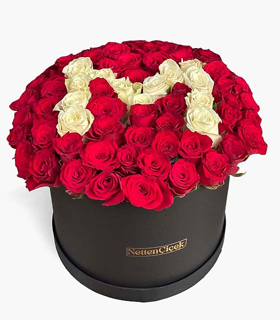 Sİyah kare kutuda Kırmızı ve beyaz güller ile tasarımı yapılan kişiye özel harfli çiçek tasarımı.