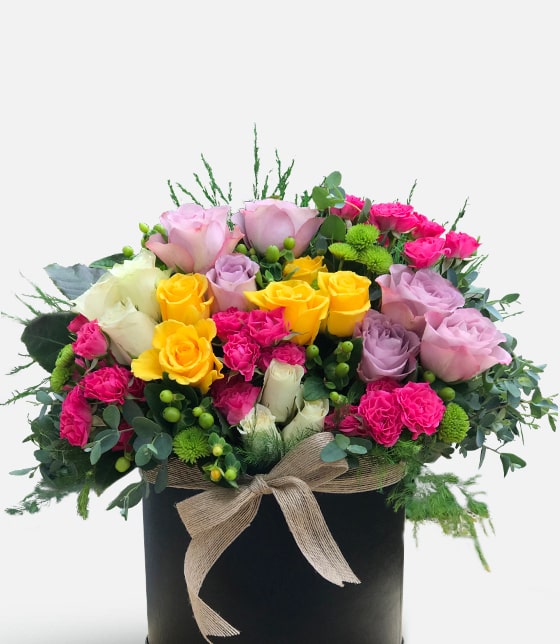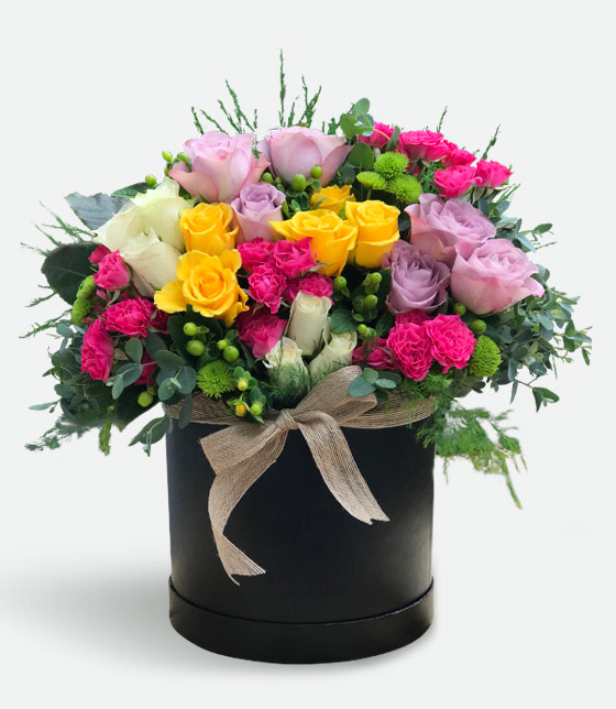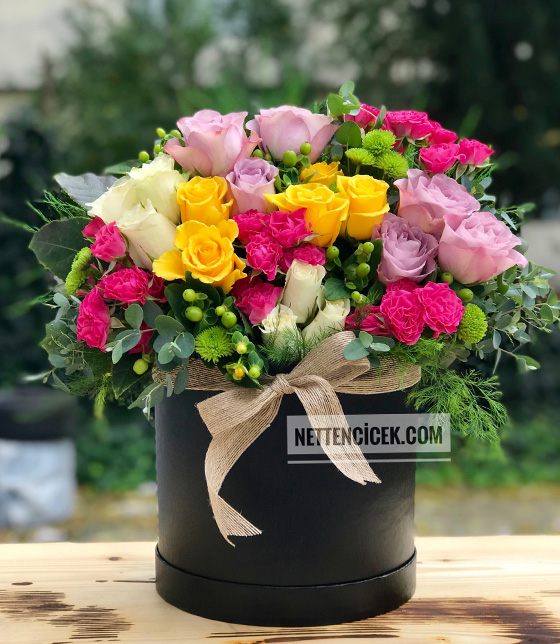 Yuvarlak hediyelik siyah kutuda renkli güller ile hazırlanan renkli gül kutusu aranjmanı
