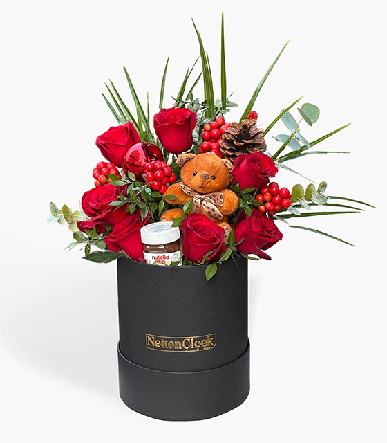 Siyah yuvarlak kutuda kırmızı gül, kokina çiçieği, ayıcık ve nutella ile hazırlanan yeni yıl çiçek tasarımı