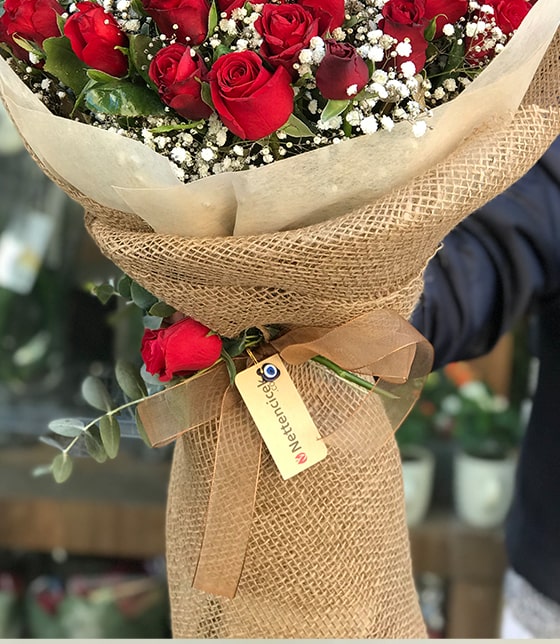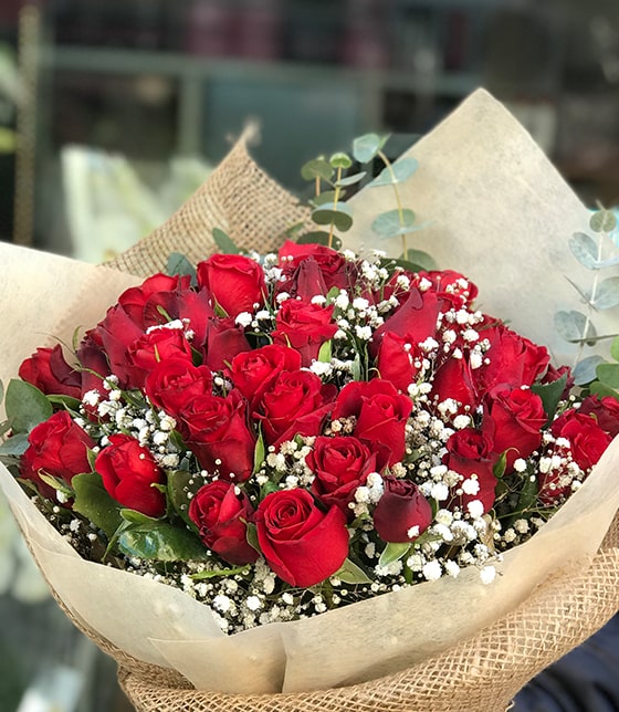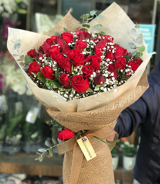 Doğal görünümlü fon kağıtları ile dış kaplaması yapılan cipsofilya ve okaliptus yeşillikleri ile hazırlanan Kırk bir adet kırmızı gül buketi