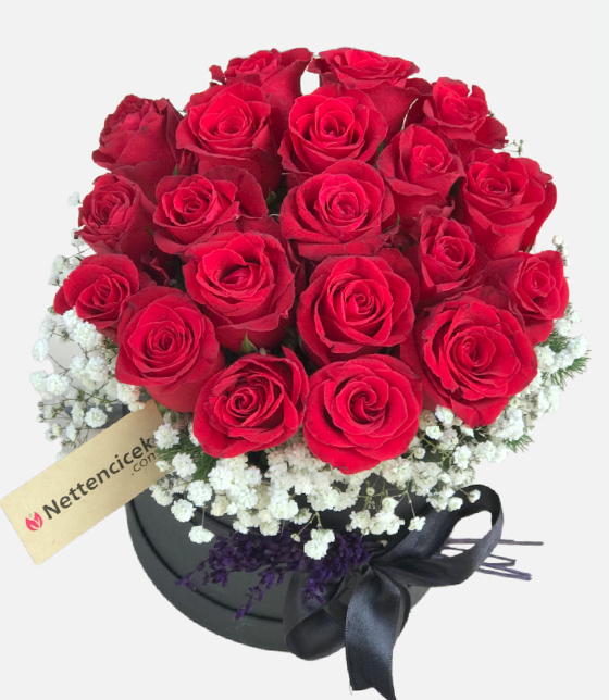 Cipsofilya ve lavantalar ile hazırlanan kutuda 20 adet kırmızı gül