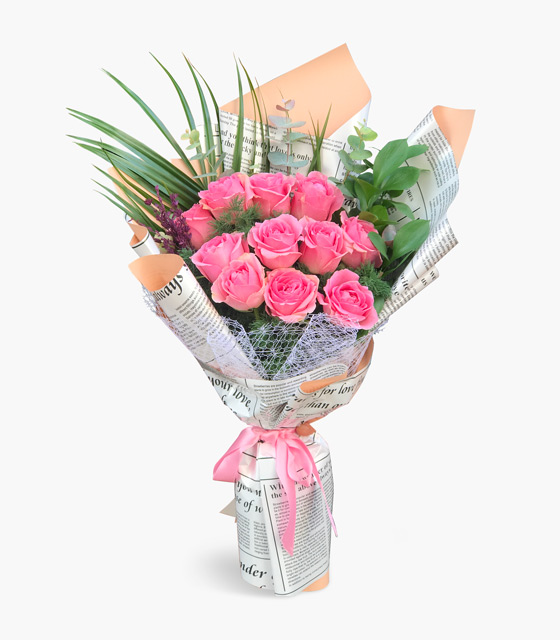 Gazete kağıdı görünümlü buket kağıdında feniks yaprağı, okaliptus ve lavanta ile hazırlanan 11 adet pembe gül buketi