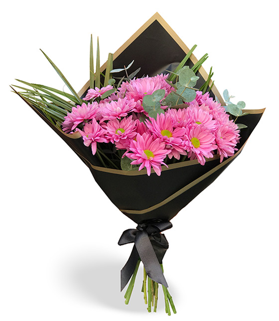 Feniks yaprakları ile hazırlanan siyah fonlu pembe papatya bbuketi