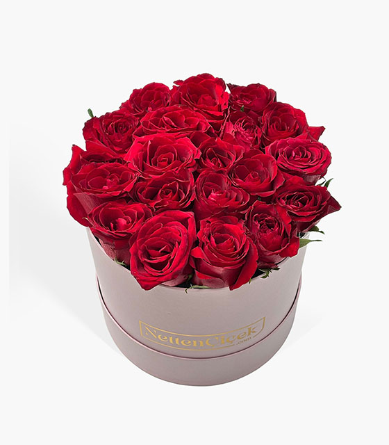 Pembe kutu içerisinde aşkın, tutkunun ve romantizmin en güçlü simgesi 20 adet taze kırmızı gül aranjmanı