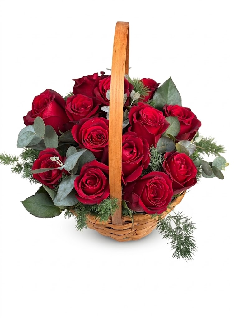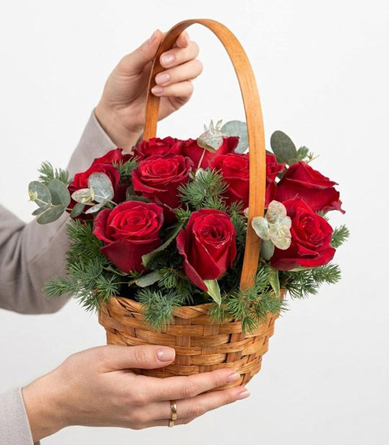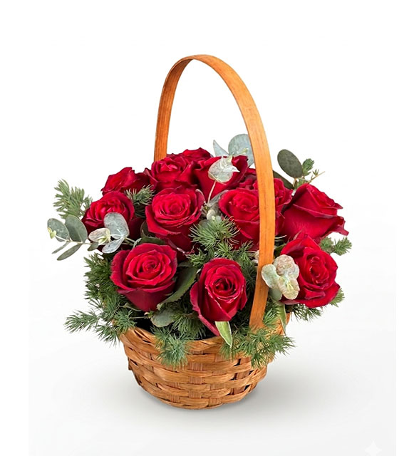 Okaliptüs ve mevsim yeşillikleriyle süslenmiş Hasır sepette 13 adet kırmızı gül aranjmanı