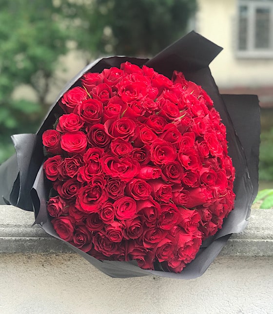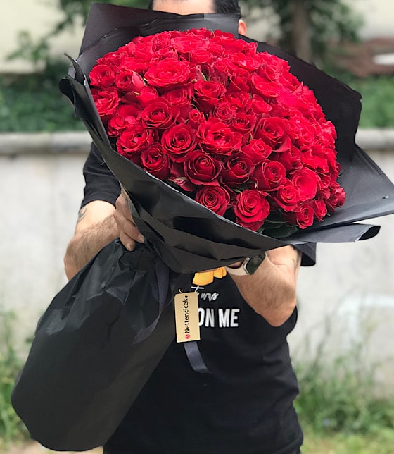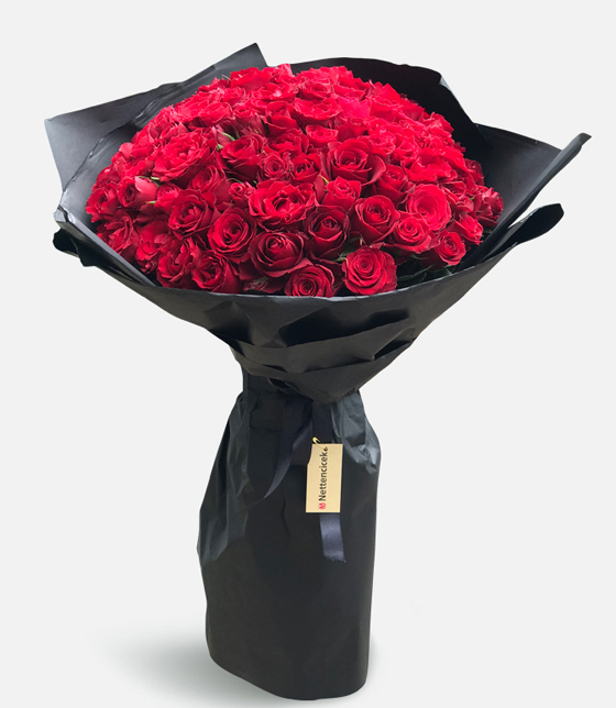Siyah fonlu sadece kırmızı güller ile hazırlanan gül buketi