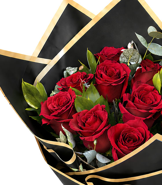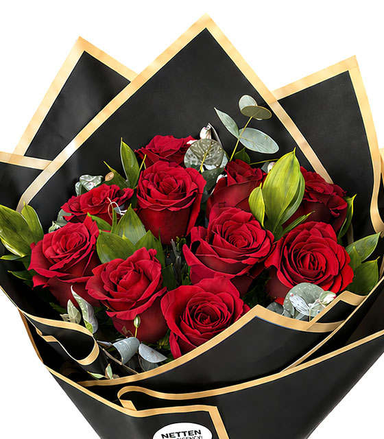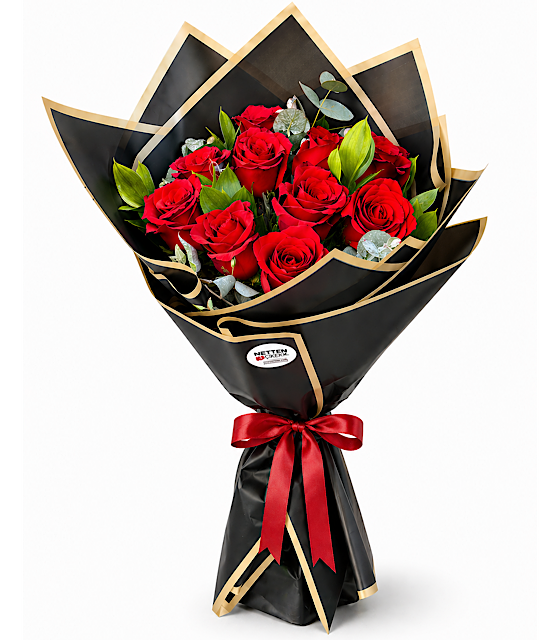 10 adet taze kırmızı gül, zarif okaliptus detayları ve şık siyah gold ambalaj ile özenle hazırlanmıştır. Kırmızı saten kurdele ile tamamlanan bu özel buket; aşkı, tutkuyu ve zarafeti en etkileyici şekilde yansıtır. Doğum günü, yıldönümü, sevgililer günü ve tüm özel anlar için unutulmaz bir hediye seçeneğidir.