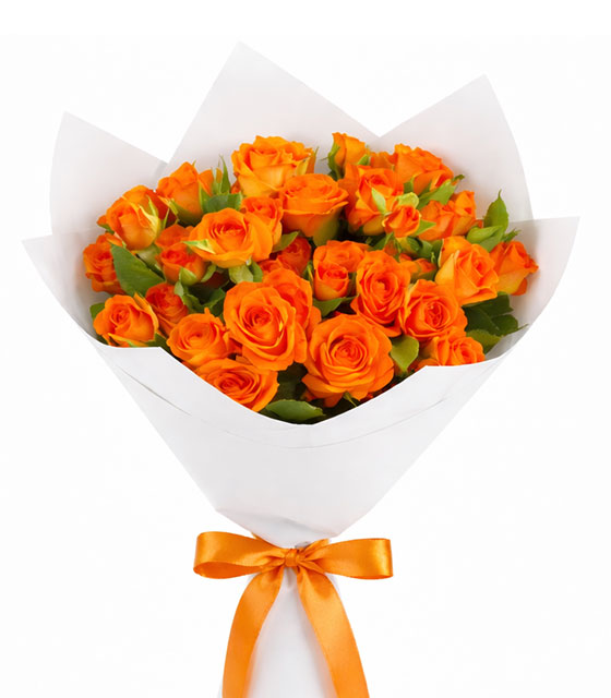 Beyaz buket kağıdı ile dış kaplaması yapılan turuncu çardak gül buketi,