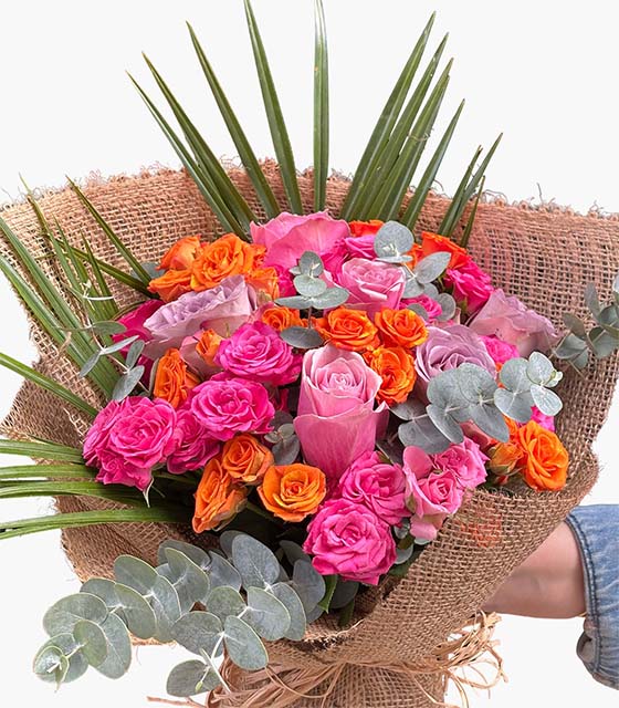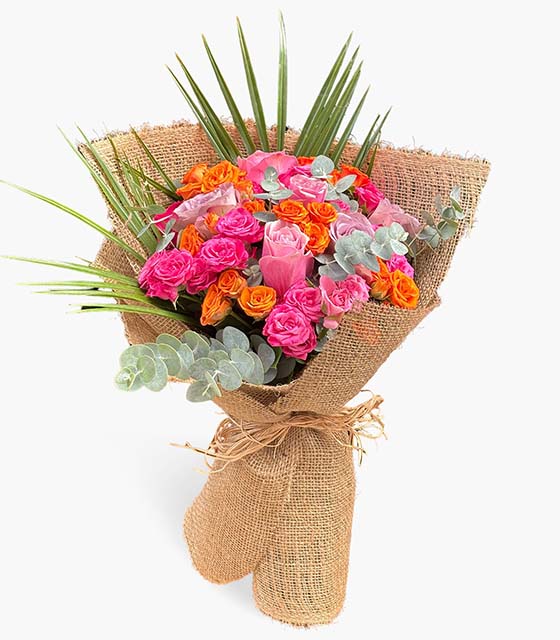 Tropik Gül Buketi, enerjik renkleriyle tutkuyu ve neşeyi bir arada sunar. Pembe, turuncu ve somon tonlarındaki güller; doğal jüt ambalaj ve egzotik yeşilliklerle tamamlanarak sıcak, samimi ve lüks bir görünüm kazanır. Doğum günü, sevgililer günü veya içten bir “seni seviyorum” demek için mükemmel bir seçimdir.