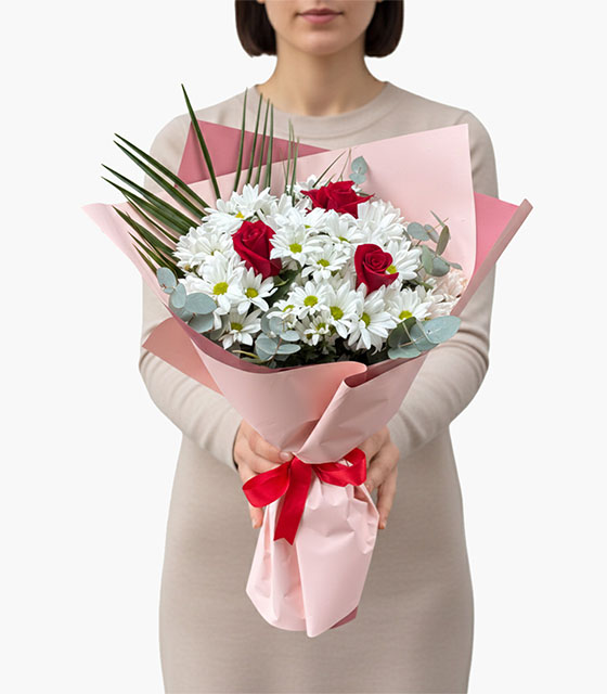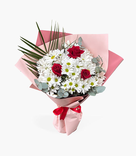 Pembe ambalajda sunulan kırmızı güller ve beyaz papatyalar, sevginizi en zarif ve romantik şekilde anlatmak için hazırlanan çiçek buketi
